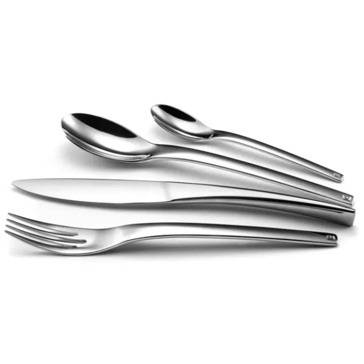 - 12 fourchettes de table, 12 cuillères de table, 12 couteaux de table, 12 cuillères à café, 1 fourchette de service et 1 cuillère de service.