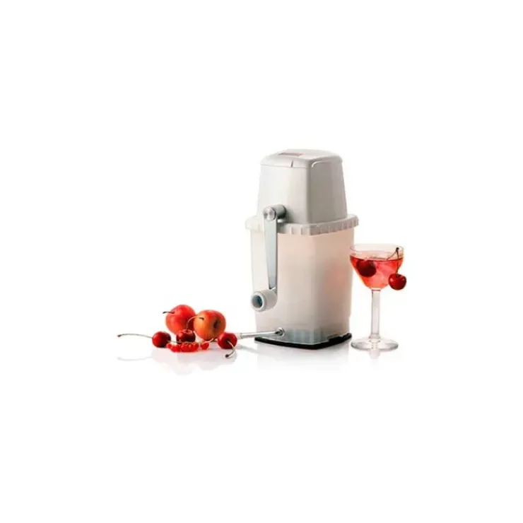Mode d’emploi broyeur à glace pilée : Placer les glaçons dans la partie supérieure de l’appareil. En tournant la manivelle, les glaçons sont broyés et tombent en glace pilée dans la partie inférieure de l’appareil.