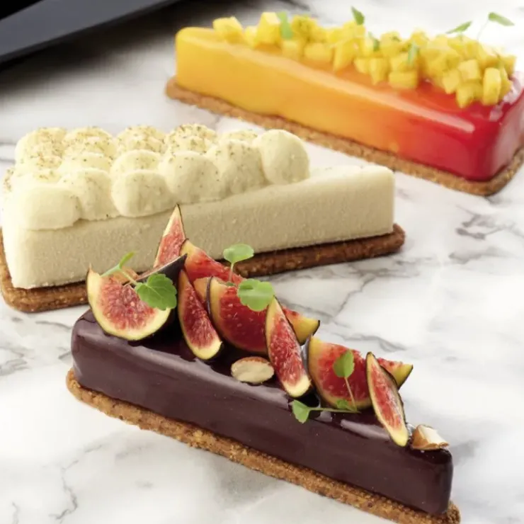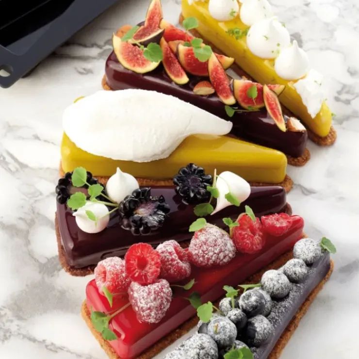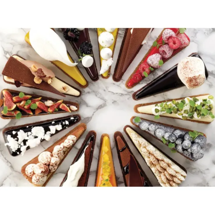 Pour un dessert original, servez des entremets déjà sous forme de parts grâce au Moule Silicone Slake imaginé par le chef pâtissier Nicolas Bacheyre. D’une hauteur de 2 cm, chaque empreinte possède une forme triangulaire semblable à une part de gâteau de 11,4 x 3,9 cm.