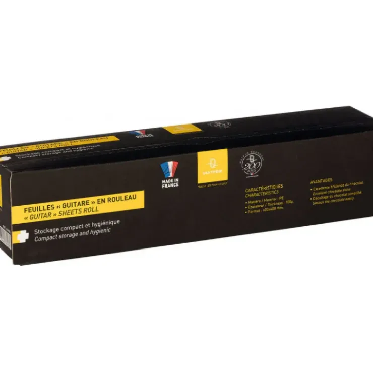 Fabriqué en polyéthylène basse densité, ce rouleau de 100 feuilles guitare deviendra votre compagnon idéal pour le travail du chocolat. Simple d’utilisation, les feuilles guitare sont idéales pour le travail du chocolat, lui assurant une excellente brillance ainsi qu’une finition propre et lisse.