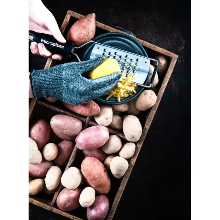 Fabriqué dans un tricot sans fil et sans coutures, ce gant de cuisine résiste aux coupures pour vous permettre de râper, trancher, couper vos aliments en toute confiance. Le gant de protection anti-coupure est spécialement conçu pour s’utiliser avec les produits Microplane, qui bénéficient de lames ultra-tranchantes. Il n’y a aucun risque de s’égratigner en les utilisant grâce à ce gant souple très résistant.