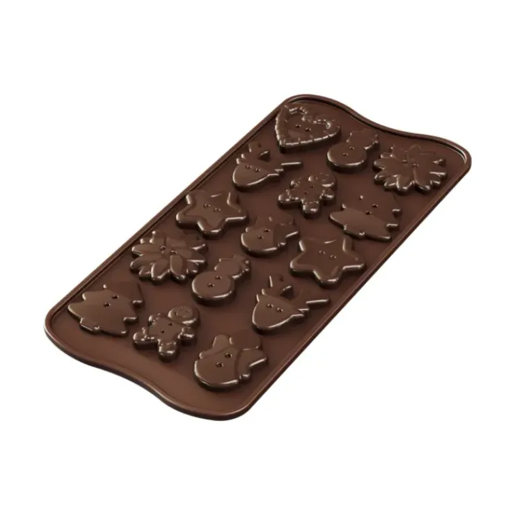 Ce moule en silicone platinum, avec ses 15 empreintes de 3,5 cm de diamètre, vous permet de créer de délicieux boutons en chocolat aux motifs emblématiques des fêtes : sapins, rennes, anges, bonhommes de neige, pains d’épice, fleurs, étoiles et cœurs.