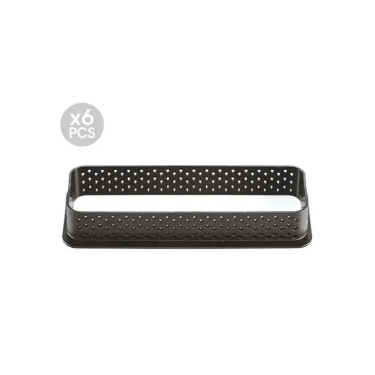 Pâtissiers et pâtissières, à vos fourneaux ! Réalisez de superbes tartelettes rectangulaires grâce au Kit Moule Rectangle Silicone 6 Tartelettes 12 cm. Ce moule rectangulaire est l’accessoire de pâtisserie qu’il vous faut puisqu’il résiste au vieillissement et sa matière anti-adhésive lui octroie une certaine souplesse ! Les grands pâtissiers sont friands de ce moule tartelette que vous avez déjà probablement vu dans une émission culinaire. Sa facilité d’utilisation, son originalité et son élégance en font un accessoire redoutable pour proposer des desserts très visuels. Alors, procurez-vous ce Kit Pâtisserie comprenant un moule silicone de 6 empreintes de 26 ml et 6 cadres rectangulaires perforés de 12 cm ! Les cadres rectangulaires ont l’avantage de posséder des petits trous qui libèrent et diffusent la chaleur sur votre réalisation, ainsi, une cuisson homogène est permise.