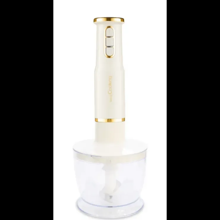 Proposé dans un design à la fois sobre et élégant, ce hachoir mixeur se pare d’une couleur crème finition mate avec un liseré doré pour la touche “wouah”.