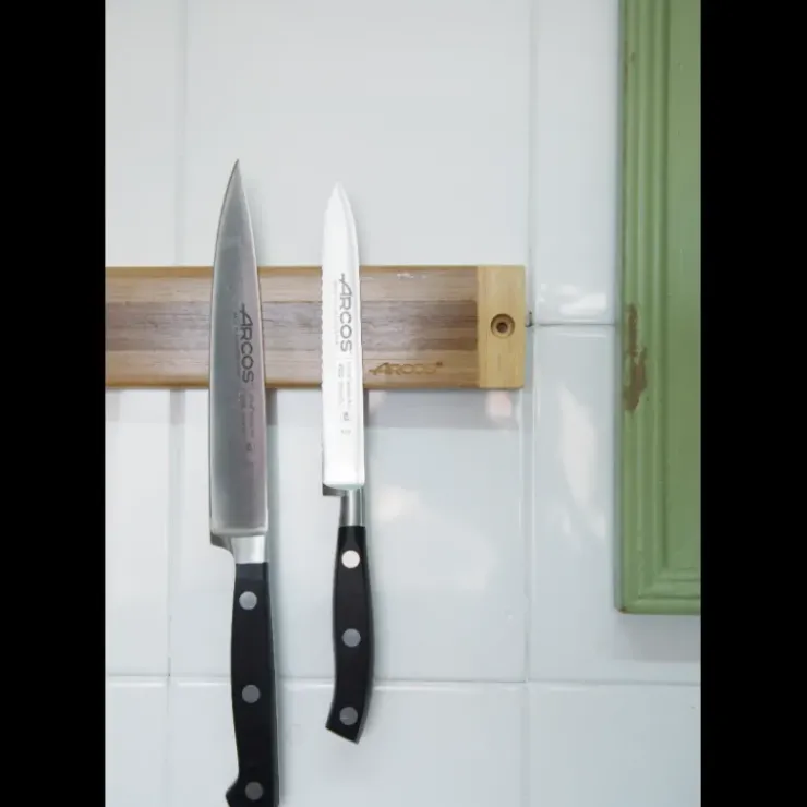 Grâce à sa barre aimantée, Arcos vous propose de ranger vos couteaux de cuisine simplement en les rapprochant du support. Il est à noter que ce système n’est utilisable que pour les couteaux à lame inox et non pour les couteaux céramiques. Les couteaux à lames en acier inoxydable sont fixés à la barre aimantée et il vous suffit d’en empoigner un pour le récupérer. Vos couteaux peuvent donc être organisés par taille ou par catégorie et être à portée de main ! Cela permet un gain de temps considérable tout en étant sécurisé puisque vous ne risquez plus de vous couper en les cherchant dans un tiroir.