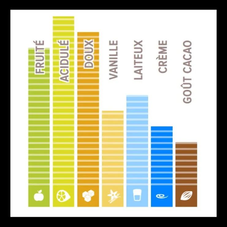 - Ingrédients : sucre, beurre de cacao, lait écrémé en poudre, lait entier en poudre, pâte de cacao, émulsifiant : E322 (soja), acide citrique : E330, arôme naturel de vanille