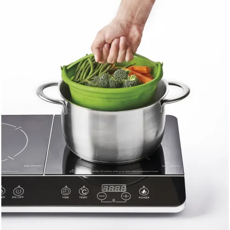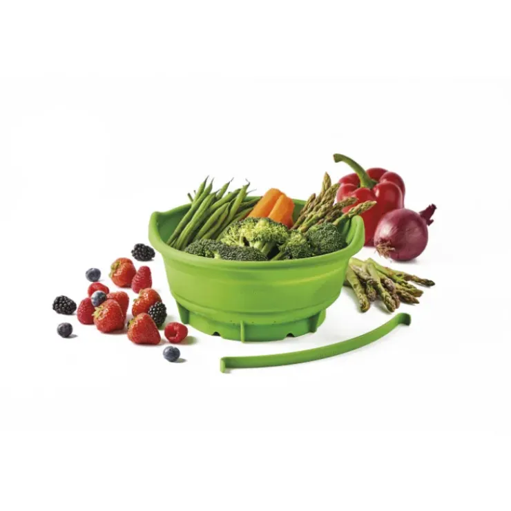 Utilisez la Passoire Silicone Rétractable pour égoutter vos aliments, mais pas seulement : elle peut également vous servir à cuire à la vapeur vos légumes ! En effet, la Passoire Pliable s’adapte sur des casseroles de 24 cm de diamètre, devenant ainsi un Panier Cuisson Vapeur avec une anse amovible. De plus, cette Passoire en Silicone supporte les températures de – 40 à 220 °C.