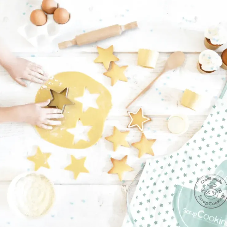 Vous trouverez ainsi à l’intérieur de cette mallette kraft 25 caissettes en papier de 6 cm de diamètre pour réaliser de délicieux cupcakes, ainsi qu’un emporte-pièce étoile en inox pour confectionner biscuits en tout genre. Ce kit pâtisserie enfant dispose également d’une cuillère en bois de 23 cm, d’un rouleau à pâtisserie en bois et d’un tablier en coton sertie d’étoiles couleur vert d’eau très tendance.